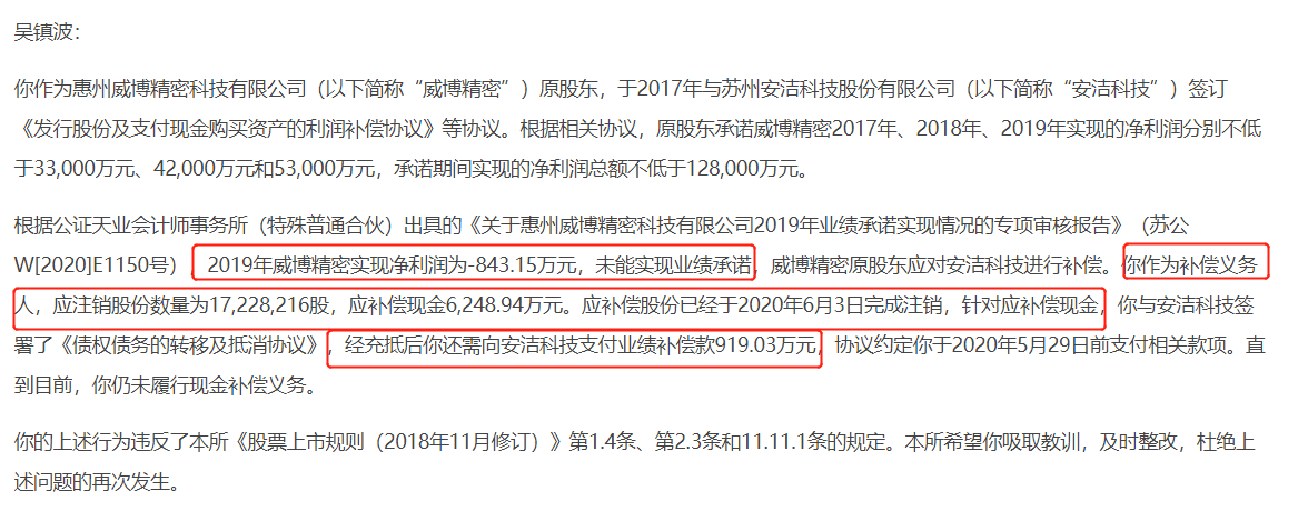 五年前,惠州威博精密科技有限公司(以下简称“威博精密”)被上市公司安洁科技收购,二者签订业绩对赌协议。因未完成业绩承诺,7月29日威博精密原股东吴镇波收到交易所下发的监管函,要求其补上拖欠上市公司的业绩补偿款919.03万元。
