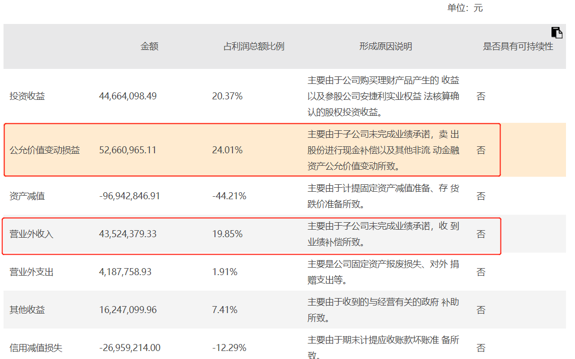 按照此种操作手法,2020年非经常性损益对净利润的影响金额为40,179万元,其中,因为未完成2019年度业绩承诺,威博精密原股东股份补偿计入公允价值变动损益,2020年度公允价值变动影响增加公司净利润3.12亿元。占当年归母净利4.68亿元的67%。