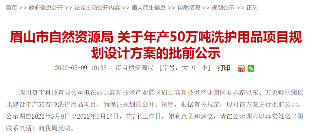 近日,眉山市自然资源局发布关于年产50万吨洗护用品项目规划设计方案的批前公示。