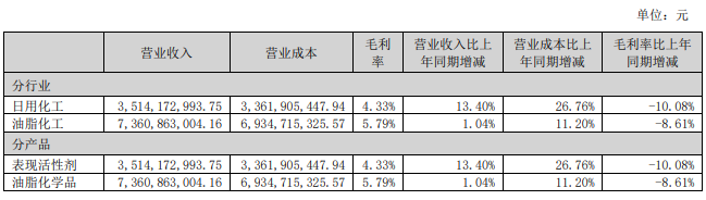 2022 年,公司实现油脂化学品营业收入 73.61 亿元,较上年同期增长 1.04%。实现销售毛利率 5.79%,较上年同期降低 8.61 个百分点。公司 2022 年销售油脂化学品数量 83.69 万吨,较上年同期增长 6.45%。