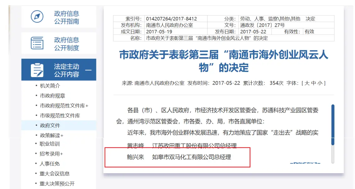 巨额资金的注入,无疑给双马化工生产经营注入了新的动力,使得双马起死回生,鲍兴来2017年还被南通市人民政府以如皋市双马化工有限公司总经理的身份表彰为“南通市海外创业风云人物”。