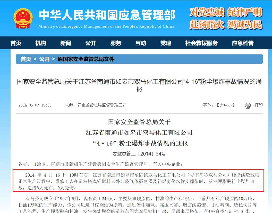然而,2014年4月16日,双马化工发生硬脂酸粉尘爆炸事故,造成8人死亡、9人受伤。20名责任人和1个责任单位受到处理,其中包括法人冒建兰在内的3名企业责任人涉嫌刑事犯罪,移交司法机关依法处理。该企业的《危险化学品安全生产许可证》被依法撤销。