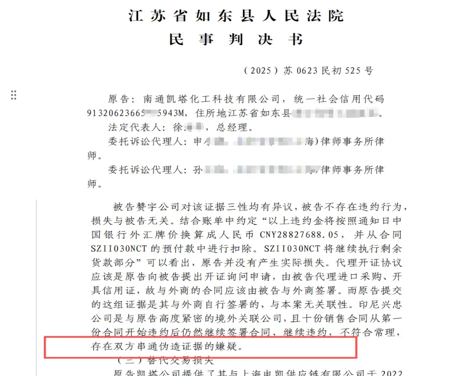 2025年初,双马化工及其实际控制人鲍兴来通过其控制的南通凯塔化工科技有限公司(以下简称“南通凯塔”),伪造代理开证违约的证据,在如东县法院对赞宇科技提起恶意诉讼,并滥用财产保全措施,在农历春节前冻结赞宇科技基本账户,导致后者无法支付供应商货款及员工工资,生产经营和企业信誉受到严重破坏。该案经法院审理,认定其伪造证据、虚构违约事实,驳回其全部诉讼请求。