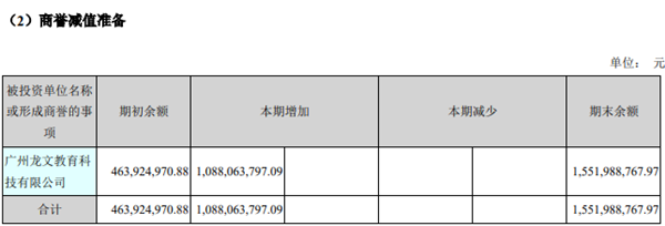 据财报显示,勤上股份对龙文教育并购共产生19.95亿元的商誉,在收购完成并表的第一年,勤上股份便计提商誉减值准备4.64亿元,当期公司净利润亏损4.27亿元。并且于2018年继续计提商誉减值准备10.88亿元,当期勤上股份净利润亏损12.49亿元。
