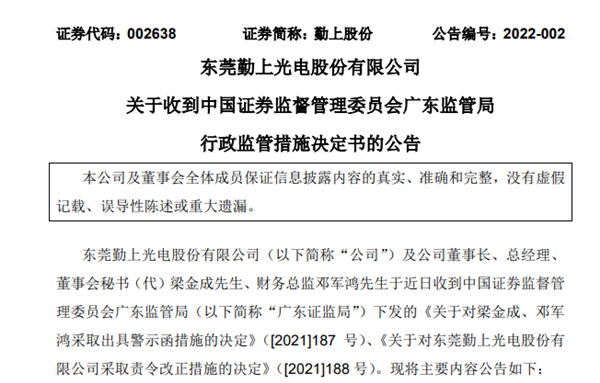 记者注意到,在发布《关于落实“双减”限价举措对全资子公司龙文教育经营影响的风险提示》的同时,勤上股份还发布了《关于收到中国证券监督管理委员会广东监管局行政监管措施决定书的公告》。