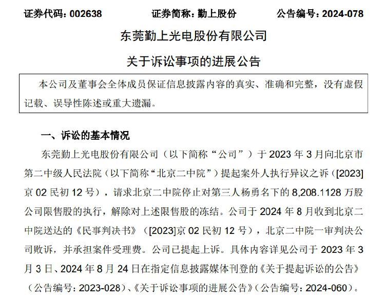 12月2日,勤上股份(002638)发布关于诉讼事项的进展公告。公司于2023年3月向北京市第二中级人民法院提起案外人执行异议之诉,请求停止对第三人杨勇名下的8208万股公司限售股的执行,并解除对该限售股的冻结。2024年8月,公司收到一审判决,判决结果为公司败诉,并承担案件受理费。公司已对此判决提起上诉。