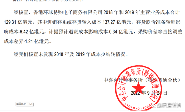 值得关注的是从2021年12月25日,公司首次公告经自查发现,环球易购2020年及以前年度将往来款项转入存货44.24亿元,将44.24亿元存货在2020年度虚假处置,其中虚增2020年度营业成本17.79亿元,2020年虚假核销存货26.45亿元。现将上述虚增的44.24亿元存货冲回并恢复增加其他应收款42.23亿元,并在相应年度全额计提减值准备,累计少结转营业成本2.01亿元。