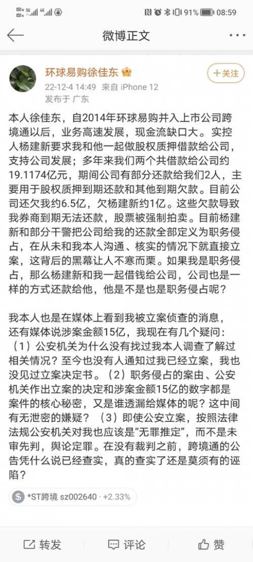 随着网络的持续发酵,徐佳东借助自媒体渠道发表声明,字里行间除了愤怒还有点撕破脸的意思。从声明的内容来看,徐认为整个事情偏离事实和办事规则,自身正当行为被人曲解放大和有色区分,并且怀疑是跨境通实控人杨建新一手操纵的,因为两个人之间存在的个人恩怨、经济纠纷,就此提出质疑。