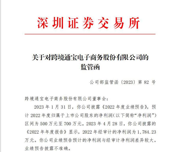 监管函指出,1月31日,跨境通披露《2022年度业绩预告》,预计2022年度归属于上市公司股东的净利润(下称“净利润”)区间为500万元至700万元。