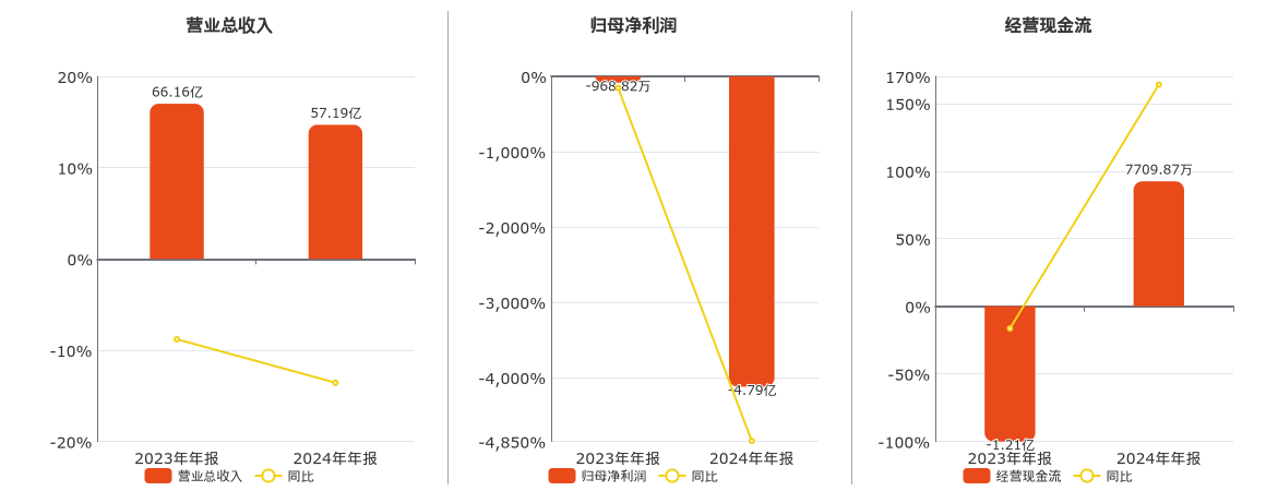 公司营业总收入为57.19亿元,较去年同报告期营业总收入减少8.97亿元,同比较去年同期下降13.56%。归母净利润为-4.79亿元,较去年同报告期归母净利润减少4.69亿元。经营活动现金净流入为7709.87万元。