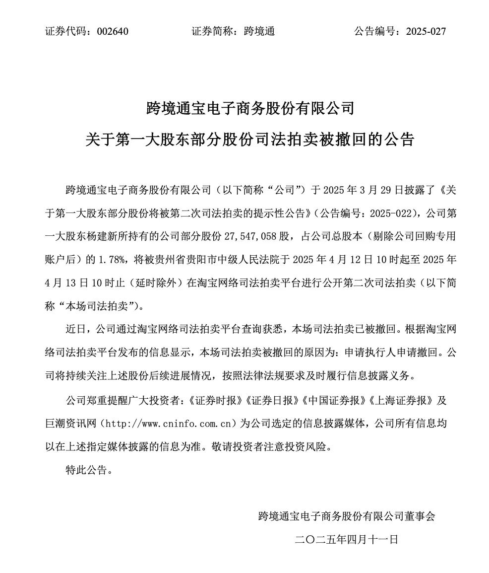 4月11日消息,日前,跨境通宝电子商务股份有限公司发布关于第一大股东部分股份司法拍卖被撤回的公告。