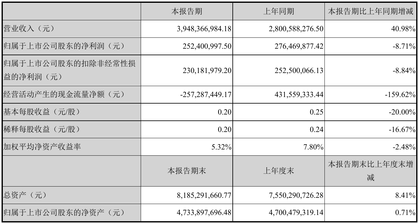8月24日,永高股份(002641)近日发布2021年半年度报告,报告期内营业收入3,948,366,984.18元,同比增加40.98%;净利252,400,997.50元,同比净利减少8.71%。