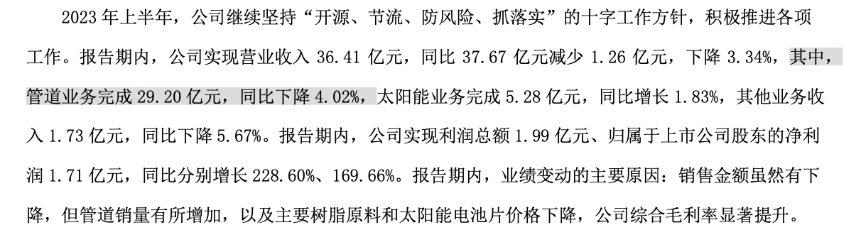 其中,管道业务完成29.20亿元,同比下降4.02%,太阳能业务完成5.28亿元,同比增长1.83%,其他业务收入1.73亿元,同比下降5.67%。