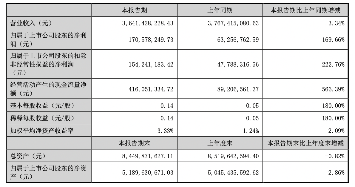 根据公告,公司实现营业收入36.14亿元,同比减少3.34%;归属于上市公司股东的净利润1.71亿元,同比增长169.66%;归属于上市公司股东的扣除非经常性损益的净利润1.54亿元,同比增长222.76%。