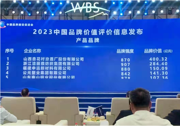 2023年5月11日,“2023中国品牌价值评价信息发布暨中国品牌建设高峰论坛”在浙江举行,新华社、浙江省人民政府、中国品牌建设促进会、中国资产评估协会等单位在浙江德清联合发布“2023中国品牌价值评价信息”。中国塑料管道行业领军企业公元股份有限公司(下文简称“公元股份”)旗下“ERA公元”位列产品品牌板块第4位,品牌价值高达141.30亿元,品牌强度为842。