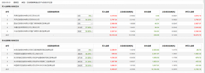 具体来看,开源证券江苏分公司、天风证券深圳分公司分别买入4919.64万元、3797.34万元;东吴证券吴江盛泽镇西环路证券营业部、中国国际金融上海分公司分别卖出2325.65万元、2281.97万元。