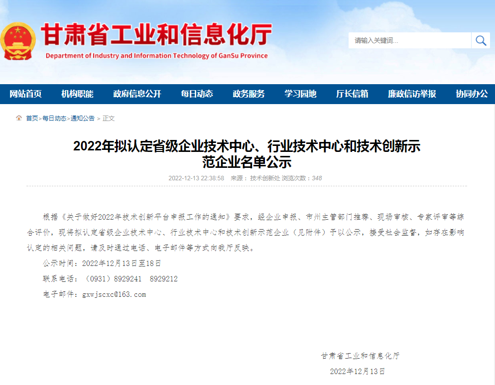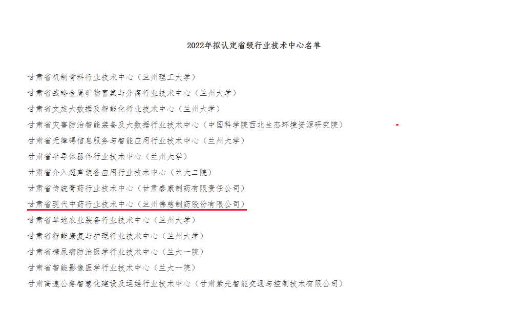 12月13日,甘肃省工信厅下发了《2022年拟认定省级企业技术中心、行业技术中心和技术创新示范企业名单公示》的文件,佛慈制药组织申报的“甘肃省现代中药行业技术中心”获得批复建设,这也是佛慈制药首次获批甘肃省行业技术中心。