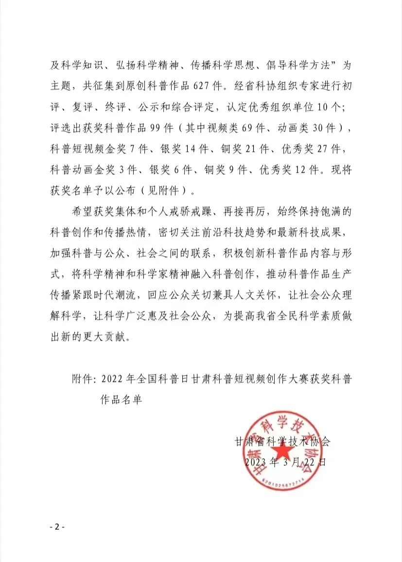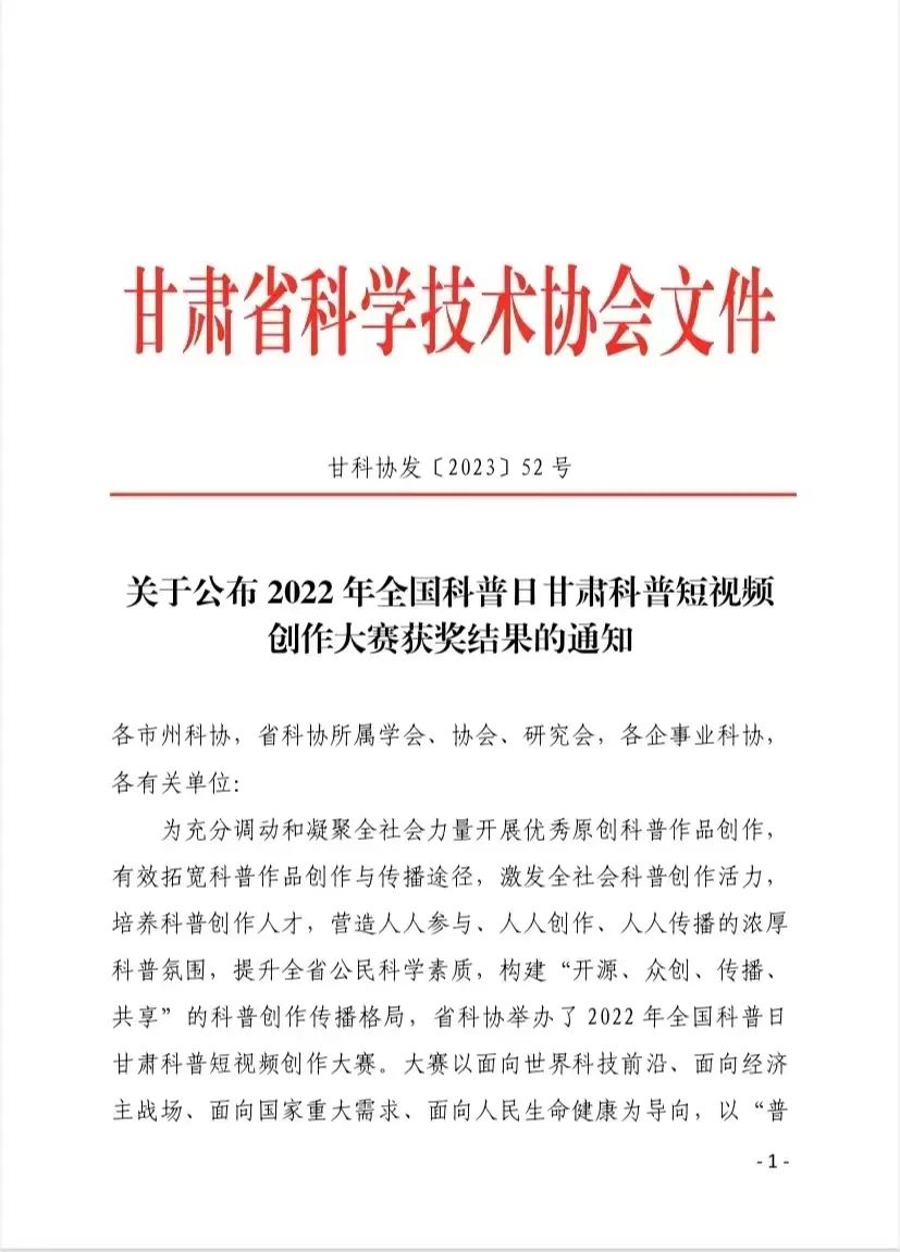 2023年3月27日,甘肃省科协“2022 年全国科普日甘肃科普短视频创作大赛”颁奖仪式正式举行。