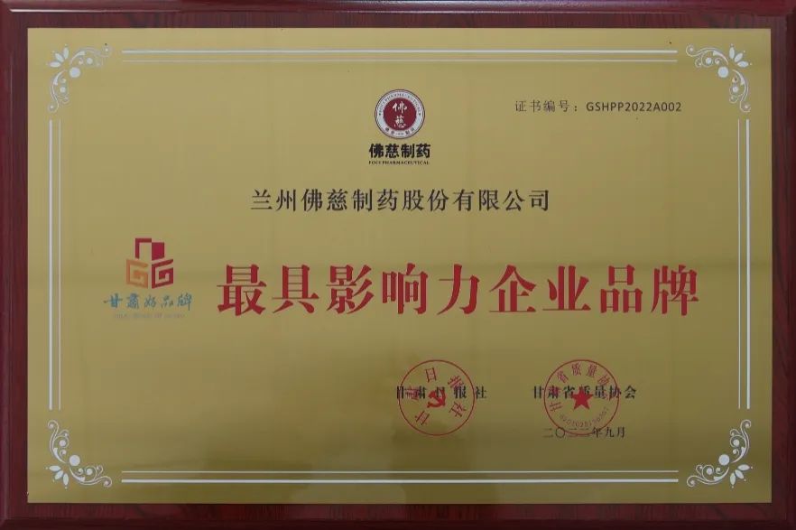 近年来,佛慈制药相继荣获“全国和谐劳动关系创建示范企业”“国家级企业技术中心”“国家级工业旅游示范基地”“国家级绿色工厂”等称号,荣获第七届甘肃省人民政府质量奖、甘肃省先进企业(贡献奖)、甘肃省中医药工作先进集体、甘肃省科技工作先进集体等多项殊荣;被甘肃省工信厅确定为“甘肃省现代中药产业链链主企业”,连续三年入选中国中医药工业百强榜。多年名列中国中成药出口企业十强,为国家首批中医药服务贸易先行先试骨干企业。