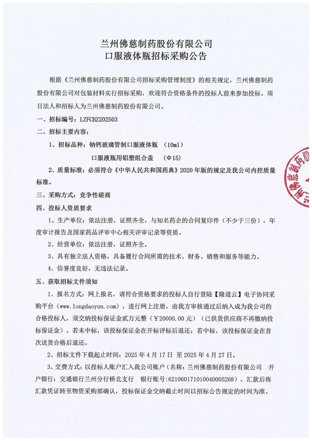 【招标公告】兰州佛慈制药股份有限公司口服液体瓶招标采购公告
