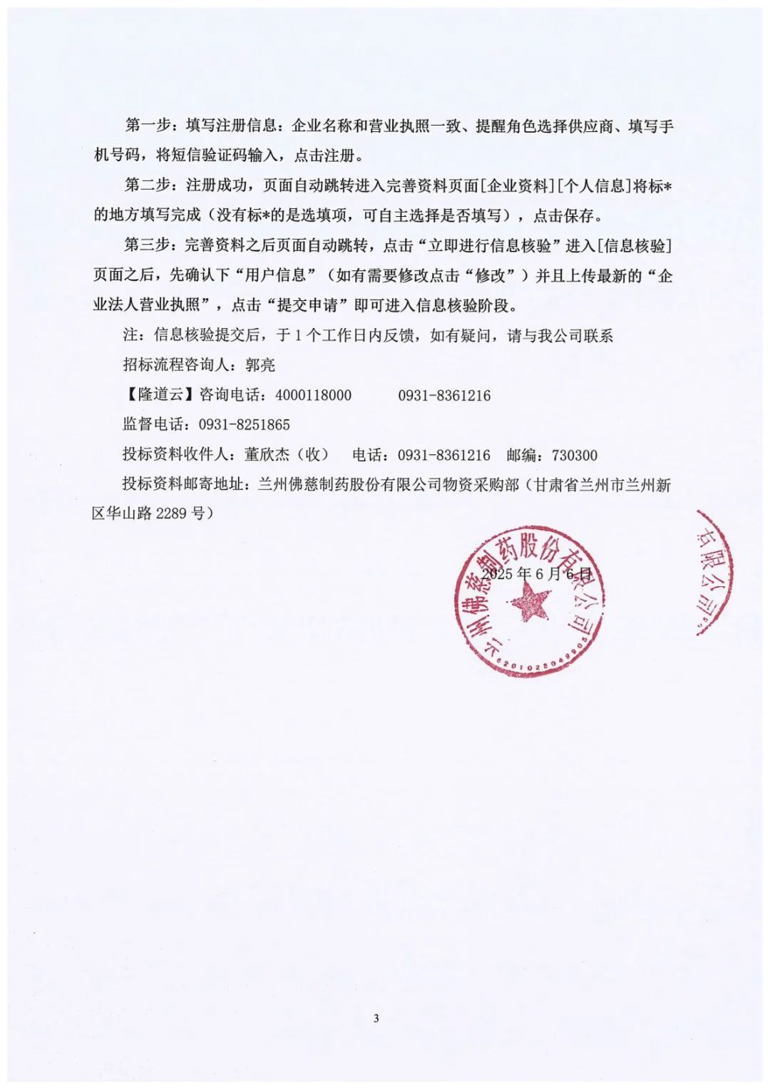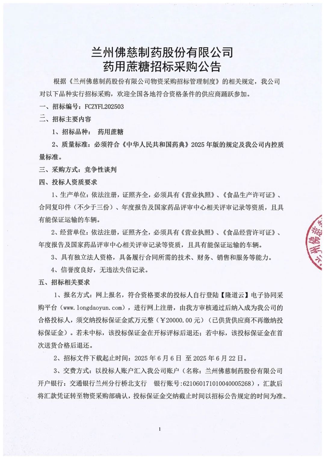 兰州佛慈制药股份有限公司药用蔗糖招标采购公告