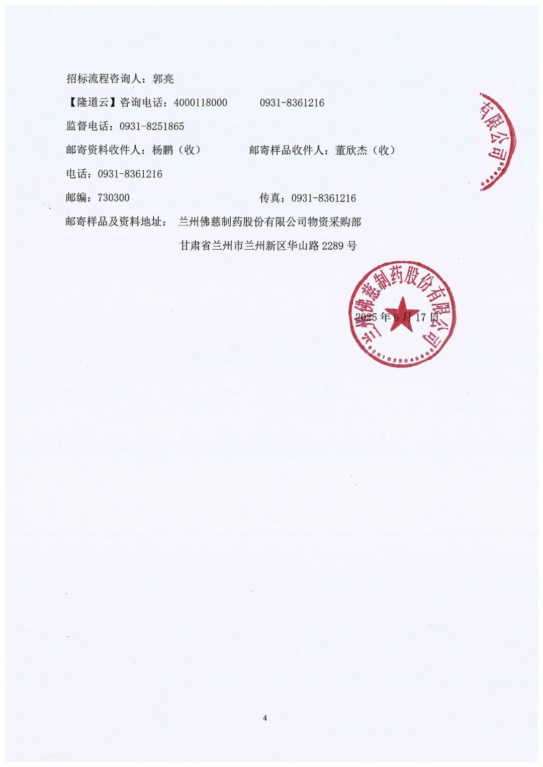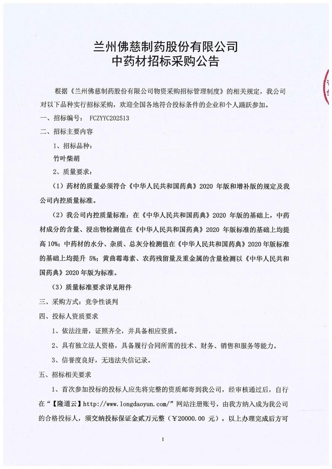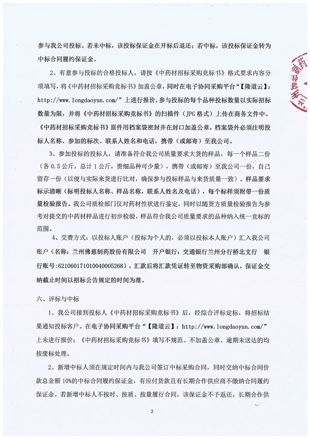 兰州佛慈制药股份有限公司中药材招标采购公告
