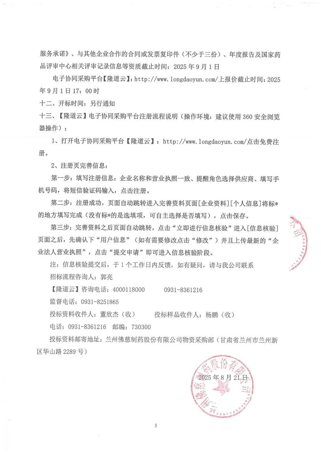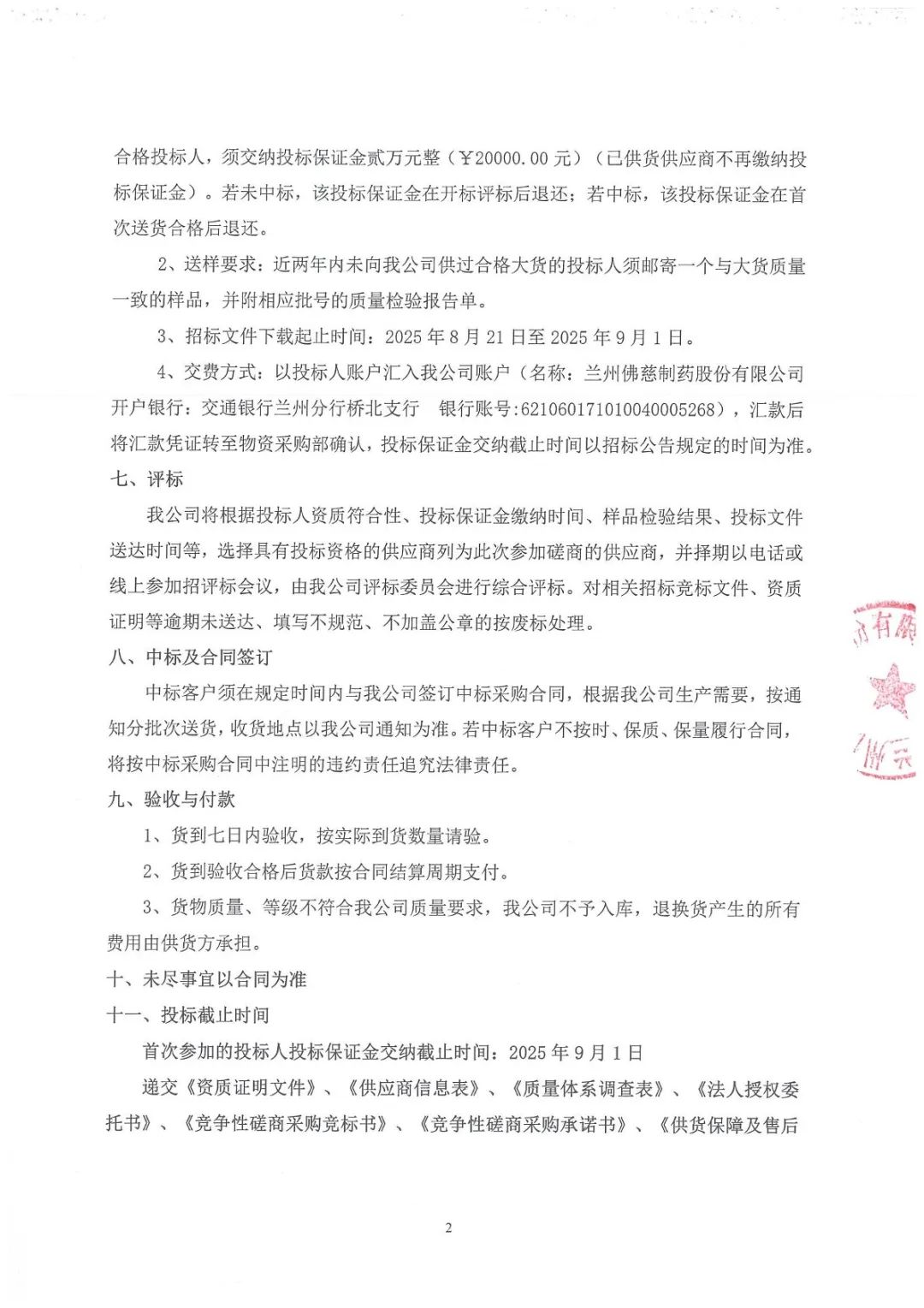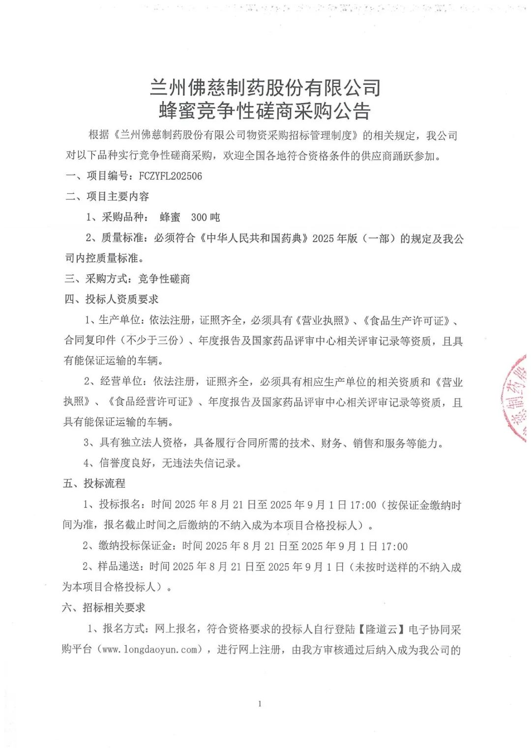 兰州佛慈制药股份有限公司蜂蜜竞争性磋商采购公告