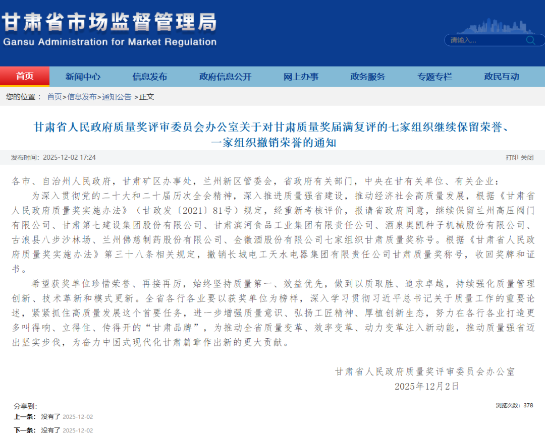 2025年12月2日, 甘肃省市场监督管理局 发布了《关于对甘肃质量奖届满复评的七家组织继续保留荣誉、一家组织撤销荣誉的通知》, 佛慈制药 凭借持续卓越的质量管理水平和突出的综合竞争优势,蝉联“甘肃质量奖”。