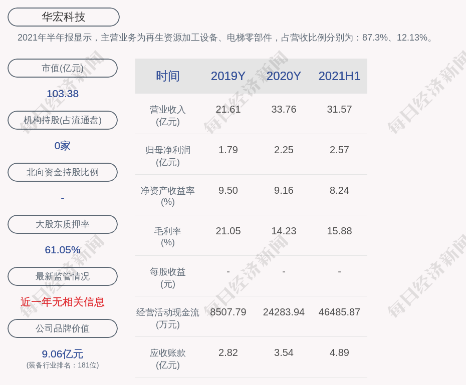 2021年半年报显示,华宏科技的主营业务为再生资源加工设备、电梯零部件,占营收比例分别为:87.3%、12.13%。