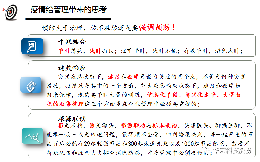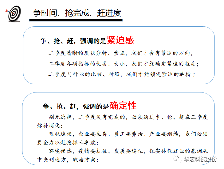 华宏科技总经理胡品龙以“战疫情,抢市场,稳产出,追目标”主题作三季度工作报告,分析了华宏科技母公司和再生资源装备及运营板块的二季度止产销完成情况,二季度的经营情况和管理情况,强调了三季度的经营目标和工作重点。