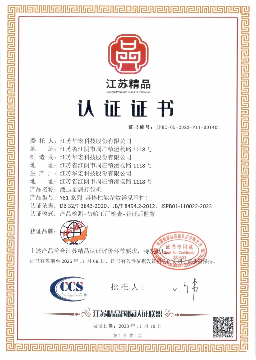 近日,华宏科技生产的“Y81系列液压金属打包机”顺利通过“江苏精品”国际联盟认证,获得“江苏精品”认证证书。