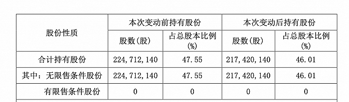 据悉,本次变动后,华实投资合计持有股份从2.247亿股,降至2.174亿股,持股比例由47.55%降至46.01%。