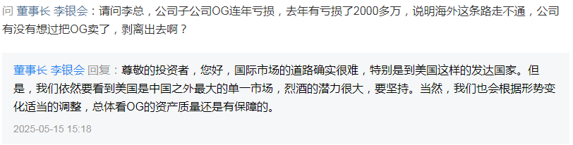 在面对投资者关于子公司OG(Oranos Group,Inc.)连年亏损的相关提问时,天佑德酒董事长李银会乐观表示,“国际市场的道路确实很难,特别是到美国这样的发达国家。但是,我们依然要看到美国是中国之外最大的单一市场,烈酒的(市场)潜力很大,要坚持。当然,我们也会根据形势变化适当的调整,总体看OG的资产质量还是有保障的。”