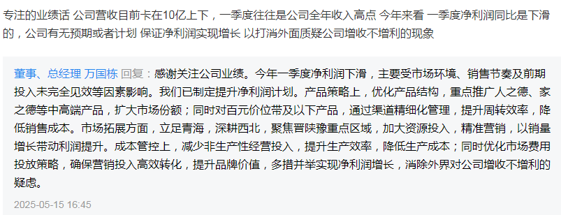 业绩说明会上,针对投资者关注度最高的“增收不增利”问题,公司董事、总经理万国栋回应称,今年一季度净利润下滑,主要受市场环境、销售节奏及前期投入未完全见效等因素影响。