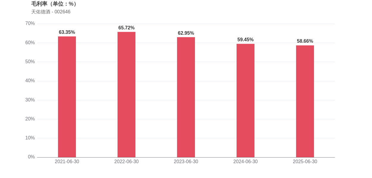 从反映盈利质量的指标来看,天佑德酒净利率由2024年上半年的10.51%下滑至7.65%,下降了2.86个百分点,已连续3年同期下滑;毛利率从2024年上半年的59.45%下滑至58.66%,下降了0.78个百分点,已连续3年同期下滑;净资产收益率2025年上半年为1.81,同比下降了0.97个百分点,已连续3年同期下滑。