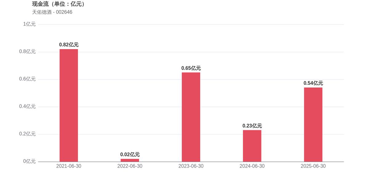 在经营稳健性方面,天佑德酒面临存货周转效率下降的挑战,存货周转天数为960.00天,较2024年上半年增长了149.92%,表明公司存货管理面临压力。经营活动产生的现金流净额为0.54亿元,相比2024年同期的0.23亿元,同比增长了0.31%。此外,2025年上半年的资产负债率为14.26%,同比下降了0.53个百分点,这意味着公司负债总额占资产总额的比重在减少。