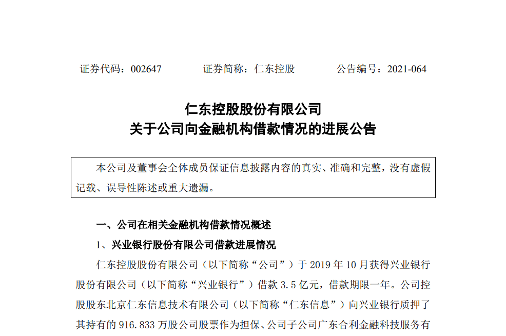 仁东控股股份有限公司,于7月31日公告公司向金融机构借款情况的进展,目前仁东控股正在积极与债权人沟通协商,通过加快回收应收账款、减少相应支出、向控股股东借款、处置相关资产等方式筹措偿债资金,尽快妥善处理贷款逾期事项。
