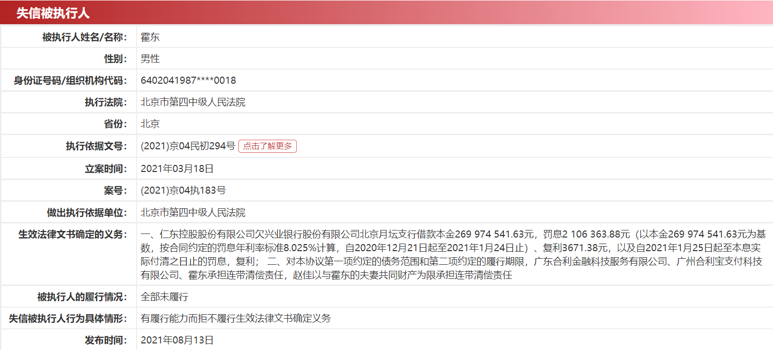 据披露,霍东被列失信以及被下发限消令系涉及仁东控股拖欠兴业银行股份有限公司北京月坛支行欠款事项。执行信息公开网显示,仁东控股欠兴业银行北京月坛支行2.70亿元本金及相应罚息、复利等,法院判决裁定,广东合利金融科技服务有限公司、广州合利宝支付科技有限公司、霍东须对仁东控股上述债务承担连带清偿责任,霍东之妻赵佳以与霍东的夫妻共同财产为限承担连带清偿责任。