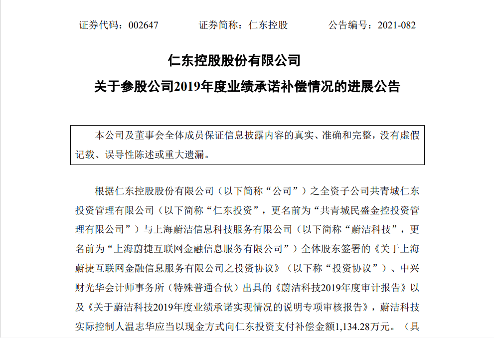 2021年9月30日,仁东控股股份有限公司发布公告称,其全资子公司共青城仁东投资管理有限公司与上海蔚洁信息科技服务有限公司全体股东签署的《关于上海蔚捷互联网金融信息服务有限公司之投资协议》、中兴财光华会计师事务所(特殊普通合伙)出具的《蔚洁科技2019年度审计报告》以及《关于蔚洁科技2019年度业绩承诺实现情况的说明专项审核报告》,蔚洁科技实际控制人温志华应当以现金方式向仁东投资支付补偿金额1,134.28万元。