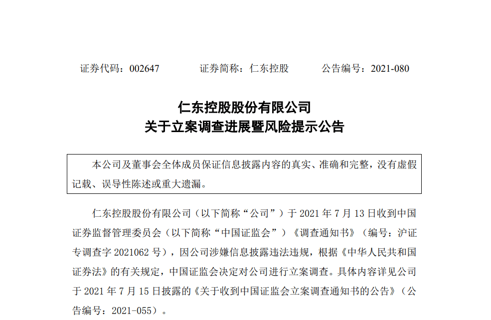 另外,仁东控股于2021年7月13日收到中国证券监督管理委员会《调查通知书》(编号:沪证专调查字 2021062 号),因公司涉嫌信息披露违法违规,根据《中华人民共和国证券法》的有关规定,中国证监会决定对公司进行立案调查。截至目前,中国证监会调查工作仍在进行中,公司尚未收到中国证监会就上述立案调查事项的结论性意见或决定。