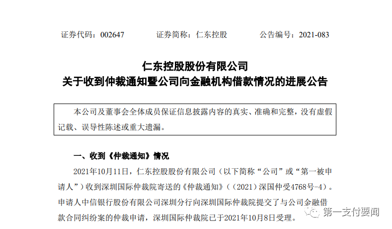 2021年10月11日,仁东控股股份有限公司(以下简称“公司”或“第一被申请人”)收到深圳国际仲裁院寄送的《仲裁通知》((2021)深国仲受4768号-4)。申请人中信银行股份有限公司深圳分行向深圳国际仲裁院提交了与公司金融借款合同纠纷案的仲裁申请,深圳国际仲裁院已于2021年10月8日受理。