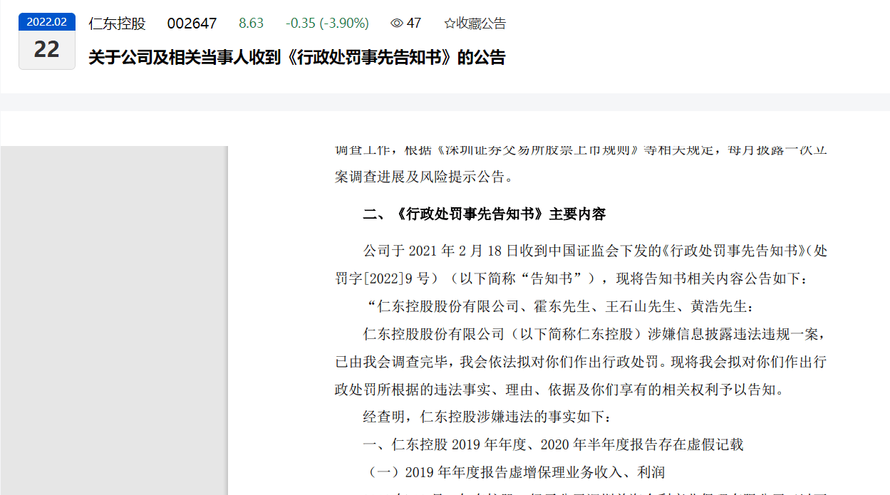 2021年2月18日,仁东控股(002647)及相关责任人员,收到中国证监会下发的《行政处罚事先告知书》(处罚字[2022]9 号)。