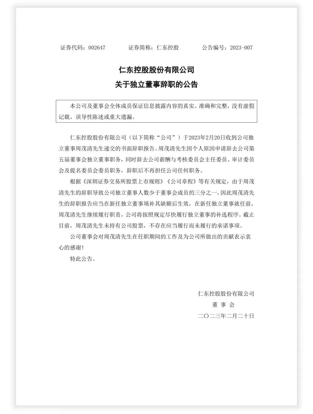 近日,『支付壹线』注意到,仁东控股股份有限公司(以下简称“仁东控股”)于2023年2月20日收独立董事周茂清先生书面辞职!