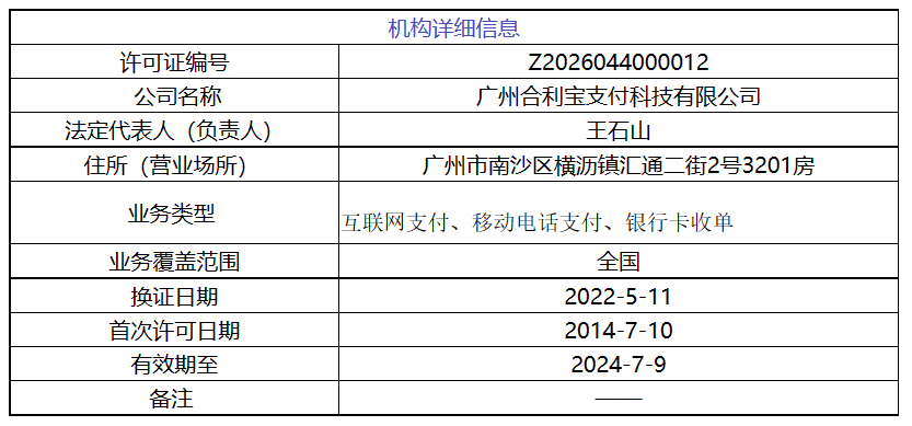 据公开信息,合利宝支付为合利金融旗下子公司,于2017年被仁东控股收购,并于2019年获支付牌照续展。合利宝经营范围包括互联网支付、移动电话支付、银行卡收单,展业范围为全国。