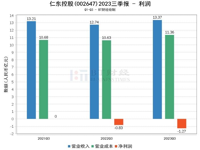 在利润方面,2023年三季度,仁东控股的营业收入为13.37亿元,相比上年同期的12.74亿元有所增长。营业成本为11.36亿元,相比上年同期的10.63亿元有所增加。毛利率为15.05%,相比上年同期的16.53%有所下降。归属于上市公司股东的净利润为-1.3亿元,相比上年同期有所下滑。
