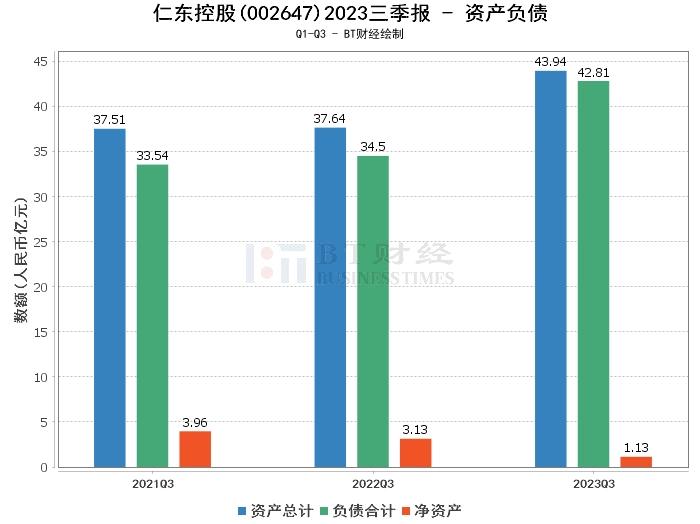 从资产负债方面来看,2023年三季度末,仁东控股的总资产为43.94亿元,相比上年度末的48.14亿元有所减少。负债合计为42.81亿元,相比上年度末的45.74亿元有所下降。净资产为1.13亿元,相比上年度末的2.4亿元有所减少。资产负债率为97.43%,相比上年度末的95.01%有所上升。