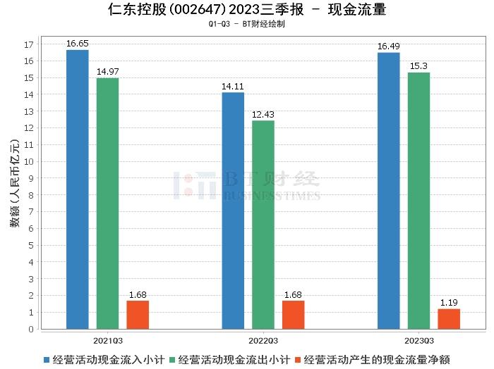 在现金流量方面,2023年三季度,仁东控股的经营活动产生的现金流量净额为1.19亿元,相比上年同期的1.68亿元有所减少。经营活动现金流入小计为16.49亿元,相比上年同期的14.11亿元有所增加。经营活动现金流出小计为15.3亿元,相比上年同期的12.43亿元有所增加。