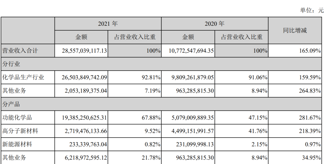 从不同板块收入来看,分为功能化学品、高分子材料、新能源材料等三大板块,其中功能化学品板块表现最为亮眼,其2021年营收达到193.4亿元,同比暴增281.7%,收入占比从2020年的47.2%增至2021年67.9%。