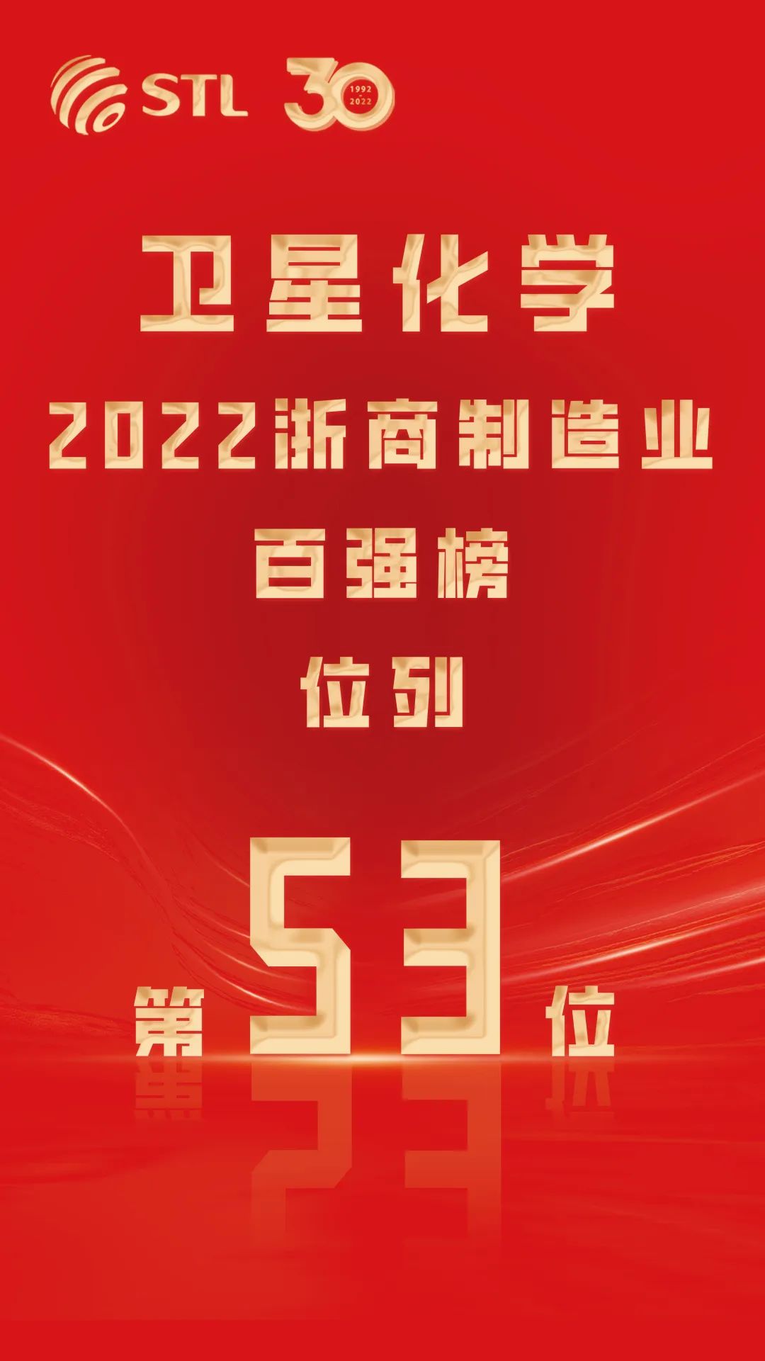 制造业是立国之本、强国之基,也是经济创新力、竞争力的主战场。11月11日,“2022浙商制造业百强榜”榜单发布,卫星化学以285.57亿元的营业收入位列第53位。