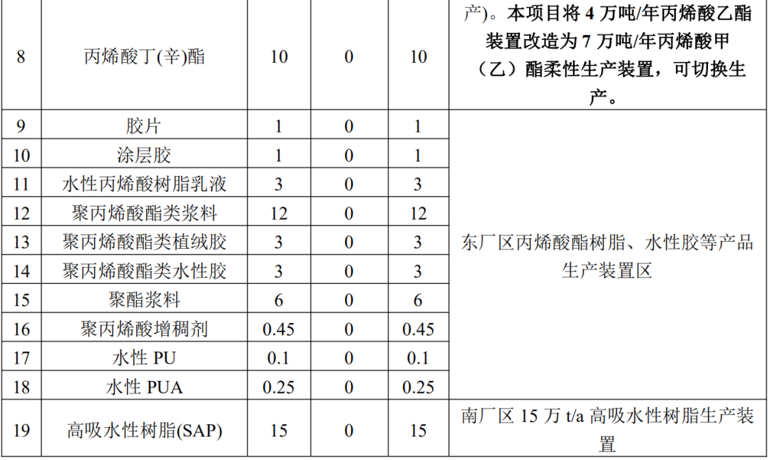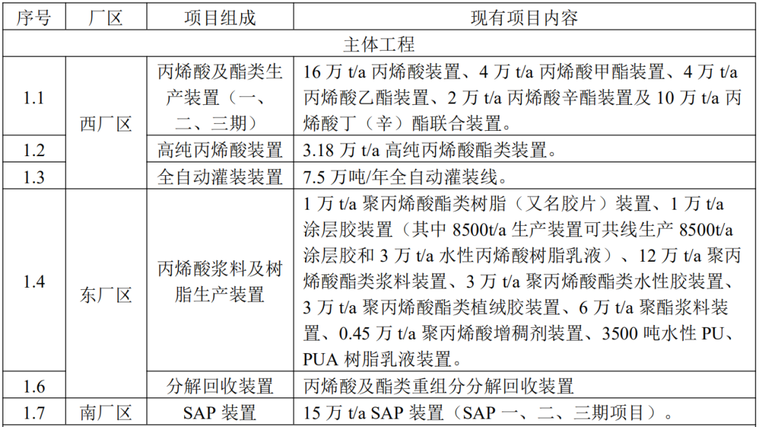 建设内容:(1)将原丙烯酸及酯类一期生产装置中 2 万吨/年的丙烯酸异辛酯装置拆除,改建成 8 万吨/年丙烯酸甲酯/丙烯酸乙酯装置;(2)将原丙烯酸及酯类二期生产装置中 4 万吨/年丙烯酸乙酯装置改扩建为 7 万吨/年丙烯酸甲酯/丙烯酸乙酯装置;(3)同时新上一套 2t/h 废液焚烧炉,用于处理丙烯酸及酯类装置重组分废液,现有 1.2t/h 废液焚烧炉改为备用炉。